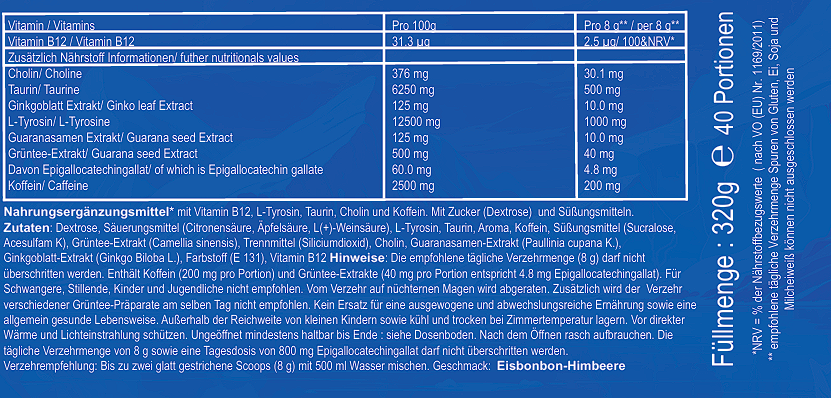 Unique and extraordinary, our Liquid Ice Performance Booster leaves no one cold! Whether you want to take an exciting ride into the blue or have your goal right in front of you, our ice blue performance booster supports you thanks to the powerful combo of taurine, choline, caffeine, guarana extract, L-tyrosine, green tea extract, vitamin B12 and ginkgo biloba.